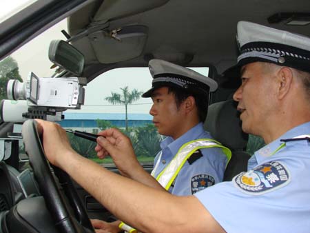 图为该大队民警正在采用高科技测速仪对过往车辆进行测速的情景