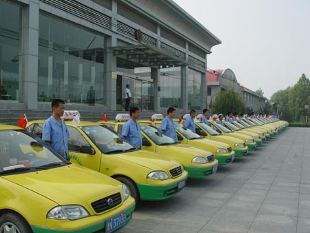 为进一步提高公共交通服务水平,提升城市对外形象,增添奥运喜庆气氛。8月8日下午,在平原县交通局的安排部署下,该县的出租车公司和通村客车公司为135辆出租车和“村村通”客运班车司机统一配发蓝色标志服,并为每部车安装了五星红旗、奥运彩旗,成为该县的一道靓丽的风景线。图为整洁的出租车和统一着装的驾驶员。