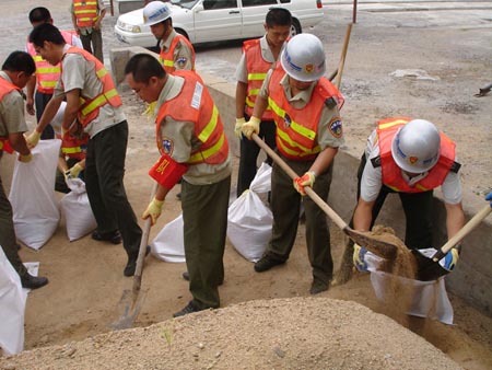 由于遭受强降雨,北引线高镇护坡出现水毁并有可能导致路基塌陷,直接威胁道路安全、畅通,接到养护巡查人员报告后,管理处立即启动防汛抢险应急预案,紧急通知养护、收费、路政防汛抢险人员34人迅速到养护工区集结,在副处长的指挥下,路政分队的抢险人员迅速对抢险地点进行交通管制,养护、收费分队的抢险人员身着反光背心,快速将装好的沙袋等防汛物资运往往抢险地点,在纵向铺开的塑料布上整齐叠放两层沙袋……