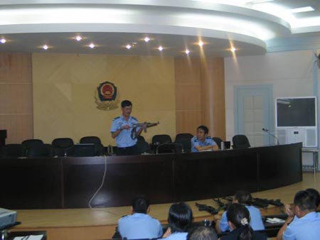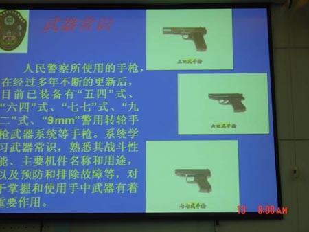 随后,市局治安支队、特警支队的3名教官通过多媒体演示、实地操作和现场示范等通俗易懂的教学方式,简要讲解了《枪支管理法》、《人民警察使用警械和武器条例》、《公安机关公务用枪管理使用规定》和《公安部五条禁令》等相关警务枪支管理使用规定,手把手传授了警用五四式、六四式、七七式、九二式、转轮手枪、微型冲锋枪和特种防暴枪、新式自动步枪、轻机枪、阻击步枪的基本实战技能。