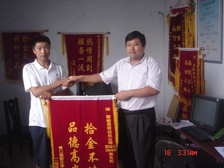 今天下午2点多钟,家住赣榆县新庄村村民李向阳先生带着一面“拾金不昧,品德高尚”的锦旗来到赣榆县客运总公司,当面感谢苏GC3048出租车的驾驶员徐长松重金面前不动心的拾金不昧精神。