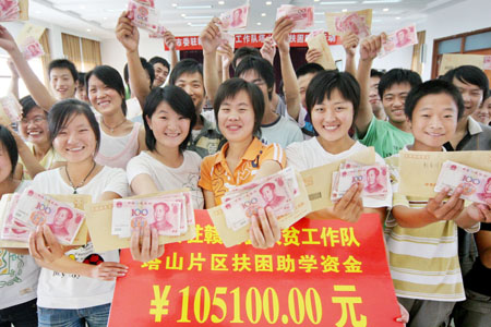 2008年8月28日,江苏省赣榆县塔山镇新考上大中专院校贫困家庭大学生喜领10.51万元助学金。当日,江苏省连云港市委驻赣榆县塔山片区扶困助学金发放仪式举行。来自该镇13个经济薄弱村109名家庭贫困、无支付学费能力的困难大学生喜领1000至2000元不等助学金。帮助他们顺利完成学业。