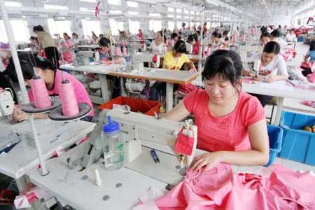 9月8日,赣榆县赣马镇黑坡村合力服装工人在生产出口服装。近年来,赣榆县大力发展出口创汇、劳动密集型企业,目前,该县出口创汇企业发展到50余家,年出口创汇近6000万美元,解决大量农村用工。