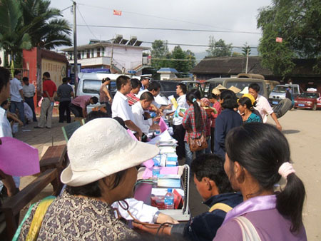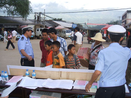 适逢勐捧镇街天,镇康县公安局交警大队抽调多名干警,利用街天群众、车辆集中的时机,针对《云南省道路交通安全实施条例》颁布未久,还不为广大群众所熟悉的实际情况,走上街头,用展板、广播、宣传单、现场讲解等方式,对广大群众进行宣传教育。在现场,众多群众被宣传展板上的内容所吸引,纷纷驻足围观。民警便以《条例》中涉及农村道路交通的内容为重点,结合发生在身边的事故,用通俗、平实的语言进行交通安全知识宣传和交通法律、法规阐释。