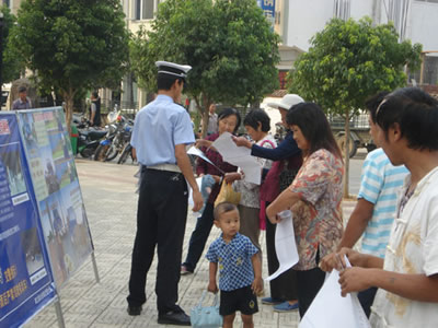 四是做广大群众及中小学生、学龄前儿童的交通安全教育。大队结合预防特大道路交通事故“百日行动”组织民警深入社区、农村、集市街场、客运企业、中小学校、幼儿园等重点部位对群众及师生进行交通安全宣传,通过摆放事故案例图板、发放宣传资料、播放宣传光碟、展出事故展版、设立交通安全咨询台、悬挂宣传标语等形式,告诫广大群众及师生不要无证驾驶摩托车、拒绝乘坐农用车、拖拉机出行,做文明守法公民,从自身做起防范交通事故,提高广大群众及师生的交通安全意识。