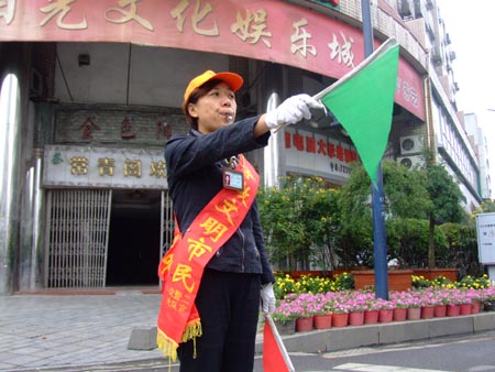 目前,创建全国文明城市已进入迎检攻坚阶段,湖南常德城区文明交通劝导员“十一”期间坚守岗位,积极投身到创建工作之中。图为10月5日早上,城区烈士街路口劝导员身披“创文”宣传彩带在路面挥旗执勤时的情景。
