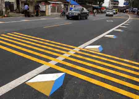 你见到过这样的公路标志线?告诉你它的名字叫三维视觉减速立体标志线。这是日前笔者驾车经过省道绍甘线浙江省绍兴市区段时拍下的一个画面。约1.5米宽,30厘米高的坡度,黄、白、蓝三块颜色组成,产生立体视觉效果,立体画面给司机眼睛视错觉,仿佛在一条白的标志线外是一个个石墩,据说,此种三维视觉减速标志线一般在两傍民居区密集,急弯等特殊路段设置,实际产生的效果和以前用的钉在地上的黄色橡胶减速带一样,并且更显眼,更安全,车行驶过去不震,噪声又小,但工艺复杂造价大。据悉,三维视觉减速立体标志线,在浙江省省公路上还称得上是第一“安保工程”。国庆期间,这条三维视觉减速立体标志线还成了绍兴市区南大门去大禹陵景区的一道靓丽风景线。