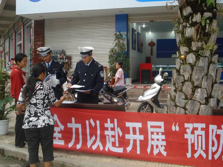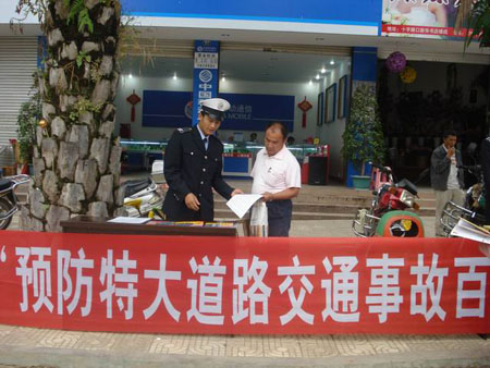 为进一步强化预防特大道路交通事故“百日行动”各项工作措施,按照《西南四省(市)“百日行动”集中整治统一行动周方案》和市公安局交警支队的有关要求,双江县公安局交警大队于10月13日在人员较集中的双江县十字路口举行了统一行动周启动仪式。