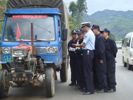 坚持“政府领导、交警为主、部门配合、社会联动、综合治理”的工作思路,积极向当地党委、政府汇报争取重视和支持,同时充分发挥主力军作用,每逢辖区赶集日、节庆日、民俗日和婚丧嫁娶日,积极与各乡镇派出所、农机站等部门密切配合、联合行动,采取定点检查和流动巡逻的勤务机制,在县乡公路出入口、村口、重点道路和集市地设立执勤点,加大路面的交通秩序管理,严查严处无证驾驶、酒后驾驶、客车超员、无牌无证机动车上路、驾乘摩托车不戴头盔以及低速载货汽车、三轮汽车、拖拉机违法载人等严重交通违法行为,及时消除安全隐患,全面净化农村道路交通环境。
