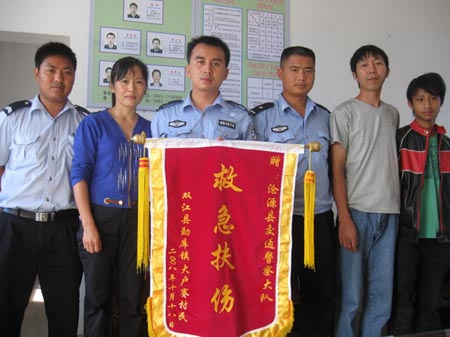 10月20日,还未痊愈的伤者字学昌携带家人专程来到大队,送上了“救急扶伤”字样的锦旗,字学昌激动地说:“你们沧源交警及时快速出警,无私救助伤员,我们一家都非常感谢;你们一心为群众安危着想,是我们老百姓的福气啊。”