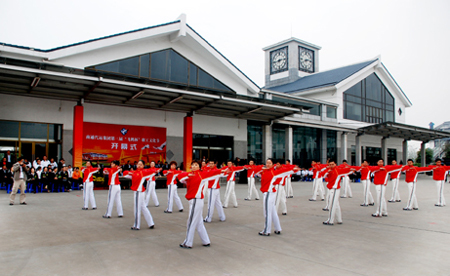 10月28下午,南通汽运实业集团公司第三届“飞鹤杯”职工文化节开幕,集团公司下属南通车站、南通客车厂等20支职工代表队共500多名职工进行了第八套广播体操比赛。图为南通客车厂代表队进行的广播体操比赛表演。
