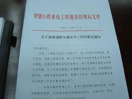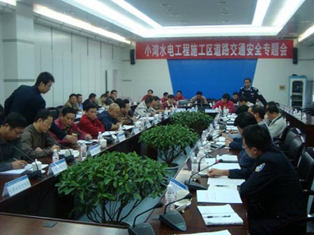 云南省凤庆县公安局交警大队小湾中队为将“百日行动”工作进一步推进,按照大队的工作部署,针对小湾电站施工区进入多雾天气,能见度低,路面开始结露湿滑,加之驾驶员超速行驶、货车载人、疲劳驾驶等交通违法行为突出的情况,为有效预防交通事故发生,消除交通安全隐患,保障行车安全,创建平安工区,小湾中队迅速反应,主动与小湾建设管理局、保卫处、小湾派出所汇报协调,并得到了高度重视和大力支持。小湾建设局10月29日下发了《关于加强道路交通安全工作的紧急通知》(小湾保[2008]17号),并召开了各参建单位、局保卫处、南涧公安局交警大队小湾中队、凤庆县公安局小湾派出所、凤庆县公安局交警大队小湾中队主要负责人参加的“小湾水电工程施工区道路交通安全专项整治会”。在会上,小湾建管局领导和保卫处领导对此次专项整治行动作了安排部署和要求: