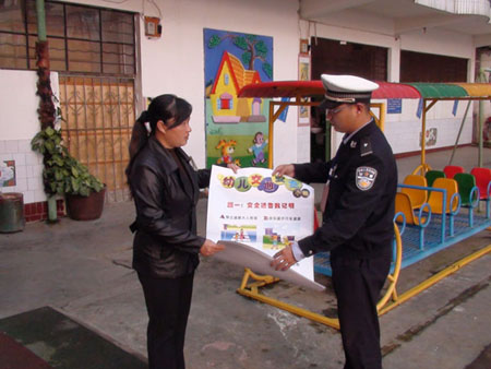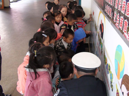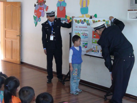 孩子是祖国的未来,教育要从娃娃抓起。为了固本强基,在孩子们幼小的心灵里就根植下平安的种子,2008年11月6日下午,永德县公安局交警大队的三名民警,来到了永德县中心幼儿园,粘贴交通安全宣传挂图、赠送宣传材料、并与孩子们一起“过家家”,给他们上了一堂生动有趣的交通安全知识课。