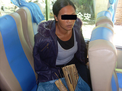 11月11日是乌木龙街天(集市贸易日),为有效预防重特大道路交通事故,永德县公安局交警大队乌木龙中队、乌木龙派出所、乌木龙刑侦中队民警联合起来,在省道羊勐线K79+200米处开展执勤执法工作,同时,根据“冬季扫毒战役”的要求,开展毒品公开查缉。10时0分,当民警登上一辆由永德县驶往凤庆县的绿色中型客车盘查时,发现三把斜靠在一个妇女旁边的扫帚把手臃肿,似有人工拆装过的痕迹,引起民警高度重视,随即进行细致检查。用工具拆开扫帚把手后,用胶带包裹的毒品海洛因露出了“冰山一角”。此时,坐在扫帚旁的妇女神情有异,可谓不打自招,民警当即将其擒拿。