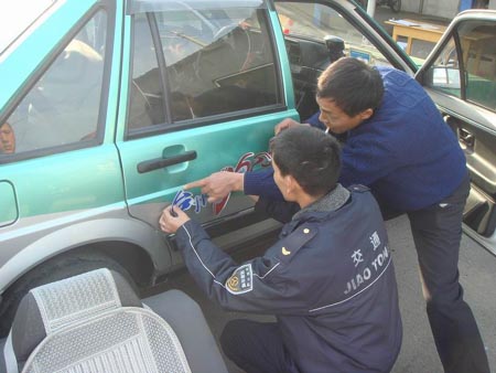 图为运管所工作人员正在帮助司机在出租车上张贴醒目的叫车热线“96550”标识。