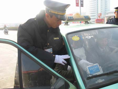 该县运管所工作人员正在对一出租车司机的从业资格进行检查