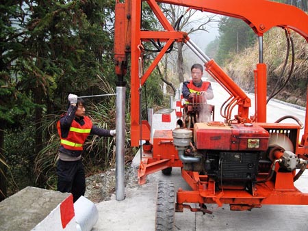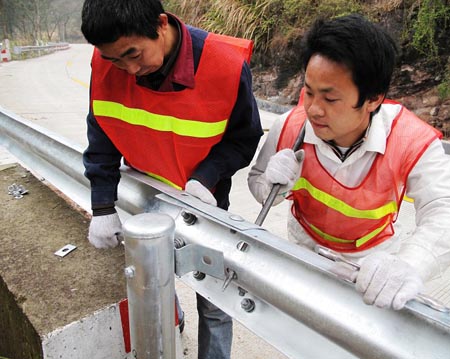3月11日上午,施工人员正在仙居县道路小线山岭路段安装钢质护栏。今年,仙居县公路部门投资3500多万元,对县内15条重要县乡道公路的安全保障设施进行完善,在水泥混凝土防护墩的基础上安上钢质护栏,确保全县农村公路安全运营和群众生命财产安全。