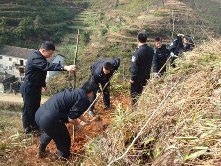 3月9日上午,民警和协管员共20人早早的来到了植树地点三清山风景区枫林村,两个组按职责分工积极的展开工作。路面交通安全保卫组戴上大毡帽、穿上反光背心,景区植树行动组则扛着锄锹迎着朝阳上山开始植树。虽然满山泥泞,但在大队领导模范带动下,全体参加劳动民警不顾疲劳、不怕苦、不怕脏,挥锄挖穴、填土植树,个个都忙得不亦乐乎。