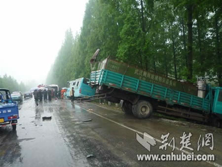 5月1日上午11时许,湖北江陵县江北农场往东3公里处发生一起恶性交通事故:一辆运鱼车(鄂D16297)因躲避横穿马路行人,再加上雨天路滑,驾驶员操作不当,导致滑向路旁撞在树上;后面由秦市开往沙市客车(鄂D20868)司机由于车速过快撞上货车车尾,导致客车冲向路旁,驾驶室严重变形,司机被卡在里面。