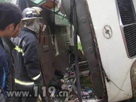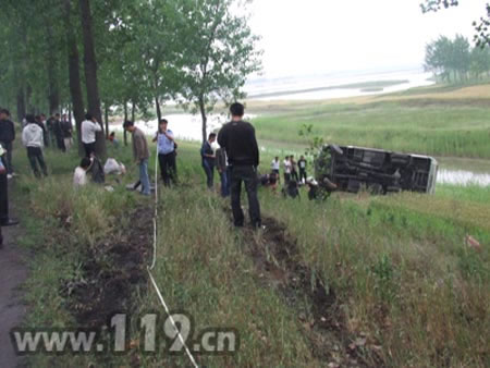 当日救援官兵到达现场后,只见一辆大客车侧翻到距离路面约7米多远的麦地里,公路上围着许多群众,部分受伤者已被抬到客车周围,由于客车从路基高处滑下,加上滑行和碰撞,客车的玻璃大部分已破碎,乘客随带的物品散落一地,现场一片狼籍。