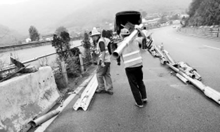 事故发生现场,工作人员正在修复被冲坏的隔离栏