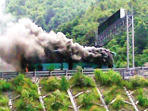 据福建东南快报报道,2009年6月2日下午1时许,位于南平和尤溪交界处的金鸡山隧道内,1辆载客卧铺大巴尾部发动机突然着火,火苗迅速往前蹿,很快整辆客车就被火海包围。当时,有两人从车上抱下2床棉被,冲向客车尾部,试图控制火势,但已来不及。所幸,当时车上10多名乘客全部安全撤离。