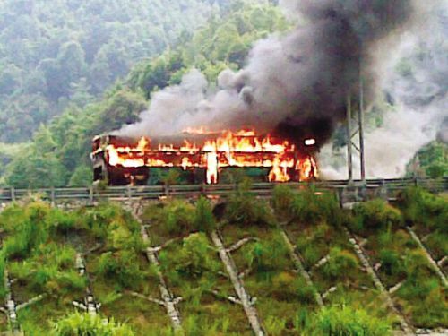 但一会儿工夫,火势就从尾部蔓延至整辆大巴。瞬间,大巴变身为“火”车,无人敢靠近。