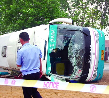 [山东]即墨市一客车侧翻 女乘客被甩出窗外压死