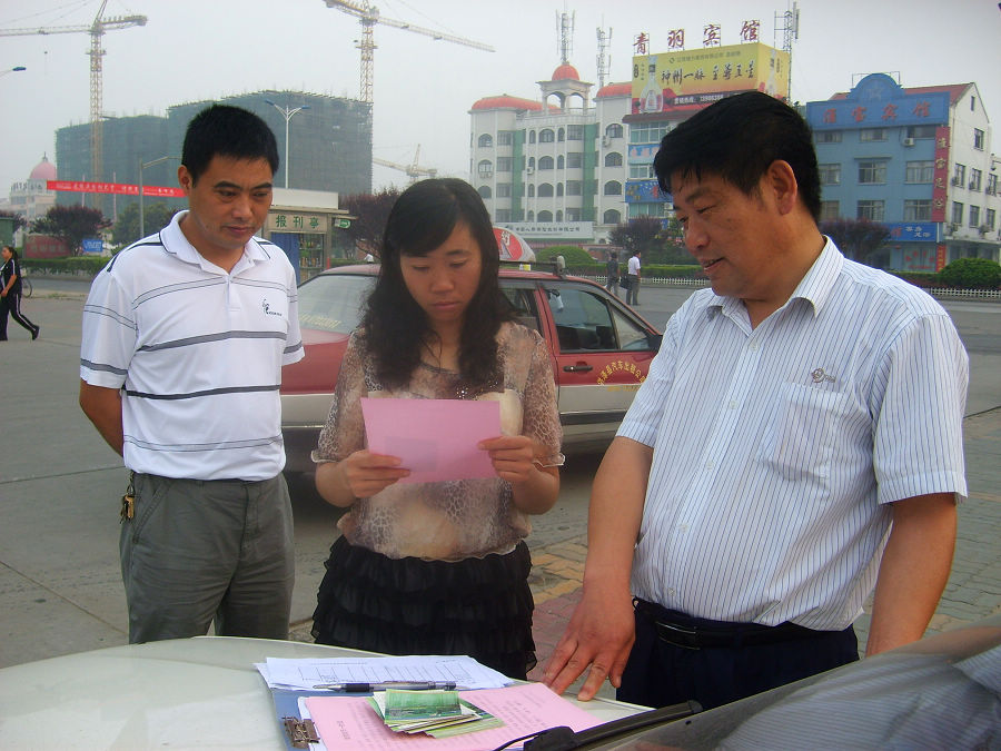 图为7月5日,该县汽车出租公司安全管理人员针对出租车营运特点,在车站、广场和人流集中的地方,向营运中的出租车驾驶员散发“给驾乘人员一封公开信”等安全资料的场景。
