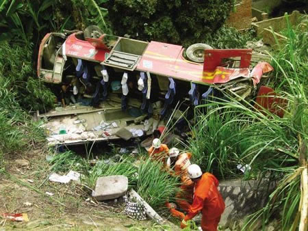 事发地段是个长下坡弯道,现场清晰地留下了两条数十米长的刹车痕迹。宽的一条是客车所留,长30多米,直接从路面冲出路基。窄的一条是小轿车所留,在路面与客车所留的痕迹相交后,转向路中间的护栏,继续向前冲出十几米。