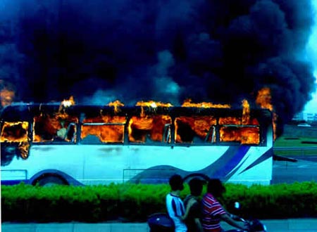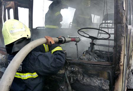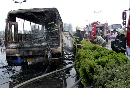 2009年7月30日,连云港市港城大道上出现了惊心动魄的一幕:上午7时20分左右,在港城大道宋跳立交桥附近,一辆满载乘客的大客车在行驶中突然起火,火势迅速蔓延。在这极其危急的关头,车上的老司机在慌乱中大声呼叫着疏散乘客,同时奋力将车上的27名乘客全部推下车去。随后呼啸赶来的市消防支队特勤中队消防队员火速赶到现场,他们立即将乘客安全疏散,用了近20分钟便将熊熊大火扑灭。目前,事故没有发现人员伤亡,事故原因正在进一步调查中。