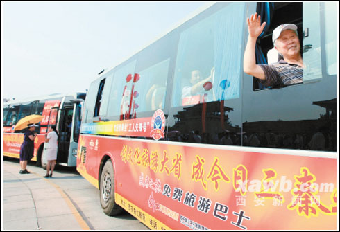 昨天上午9时30分,4辆从大唐芙蓉园御苑门前开出的旅游巴士载着100名西安市民前往宝鸡扶风县,游览法门寺景区,体验刚刚开通的盛唐之旅免费旅游巴士。
