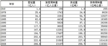 交通基础设施的大规模建设和运输装备的不断改善,促进了交通运输生产的持续快速发展。2008年全国主要运输方式完成客运量286.79亿人、旅客周转量23196.70亿人公里,分别是1949年的209倍和150倍,年均分别增长9.5%和8.9%;完成货物运输量258.74亿吨、货物周转量110300.83亿吨公里,是1949年的161倍和433倍,年均分别增长9.0%和10.8%。其中,铁路完成客运量、旅客周转量14.62亿人和7778.60亿人公里,是1949的14倍和60倍,年均分别增长4.6%和7.2%;完成货运量、货物周转量33.04亿吨和25106.28亿吨公里,是1949年的59倍和136倍,年均分别增长7.2%和8.7%。公路完成客运量、旅客周转量268.21亿人和12476.11亿人公里,是1949年的1483倍和1567倍,年均分别增长13.2%和13.3%;完成货运量、货物周转量191.68亿吨和32868.19亿吨公里,是1949年的241倍和4038倍,年均分别增长9.7%和15.1%。水运完成货运量、货物周转量29.45亿吨和50262.73亿吨公里,是1949年的116倍和796倍,年均分别增长8.4%和12.0%。民航完成客运量、旅客周转量1.93亿人和2882.8亿人公里,是1949年的713倍和1558倍,年均分别增长11.8%和13.3%;完成货运量、货物周转量407.64万吨和119.60亿吨公里,是1949年的170倍和570倍,年均分别增长9.1%和11.4%。管道完成货运量、货物周转量4.54亿吨和1944.03亿吨公里,是1971年的39倍和216倍(管道货运量、货物周转量从1971年开始统计),年均分别增长10.4%和15.6%。