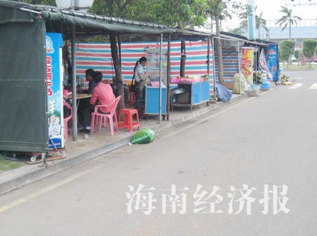 可是,火车站外的景象却是大相径庭。两排临时搭建的简易棚突兀地矗立在火车站进出口处,成为海口火车站靓丽形象的一个污点。一小卖部老板告诉记者,这些简易棚已经在海口火车站外搭建了很长时间,有人定期向每个“商户”收取费用。至于这些简易棚的管理者是谁,该老板只称:“我不好说。”