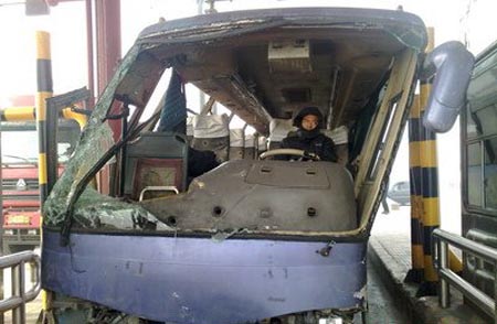 这辆车前后挡风玻璃全碎了,车体整个向右倾斜了15度,车身上下不是裂口就是裸露的电线。司机为了抵御高速上的寒风,也全副武装,羽绒服帽子拉起,将自己裹了个严严实实,准备这样通过站口。