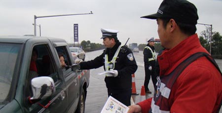 在常张高速公路连接线入口春运检查站民警为过往驾驶人发放宣传资料