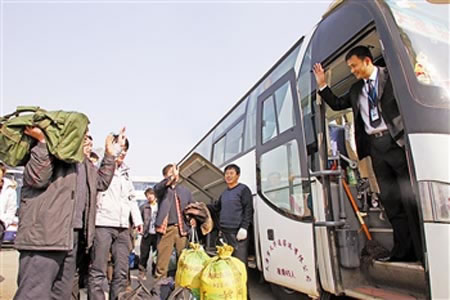 昨天(21日),从河北省来津的40名务工人员由长途汽车直接送到务工场所。天津市天环客运站和通莎客运站推出“门对门”服务,团体返津的外来务工人员均能享受到一站式服务。