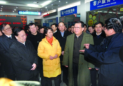 2008年抗击雪灾期间,中共中央政治局常委李长春(前右二)在傅家坡客运站视察春运工作时,听取湖北公路客运集团董事长庄宝麟(右一)汇报工作。