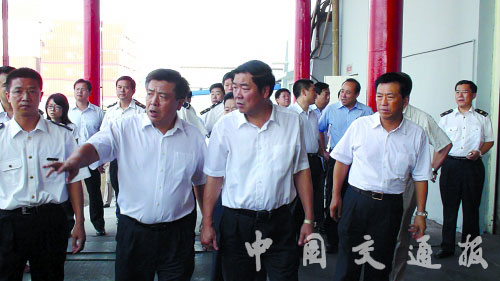 图为刘明田总裁陪同天津市委常委、副书记、滨海新区工委书记何立峰(左二)、天津出入境检验检疫局局长、党组书记兰影(左一)视察振华。