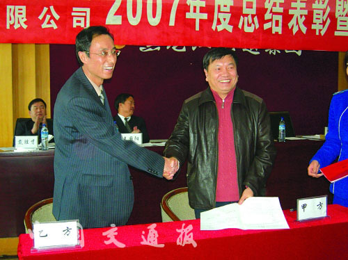 李明利(右一)与客运公司总经理签订经营、安全生产责任状。
