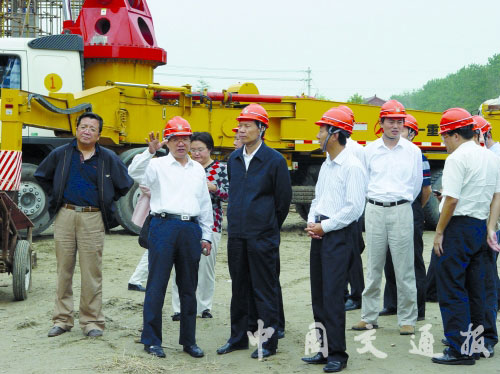 总经理时雨(左二)向时任江苏省交通厅厅长潘永和(左三)汇报新东站建设情况。