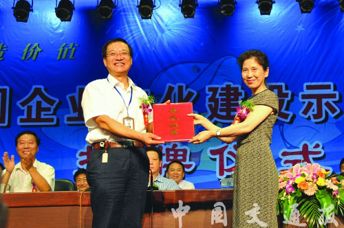 中国企业文化促进会向江苏扬汽运输集团总经理时雨(左)颁发“全国企业文化建设示范基地”荣誉证书。