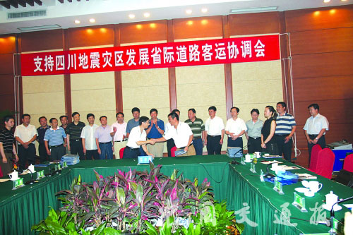 邱小发局长与支援四川灾区的运管同行签订省际客车开行运输协议。