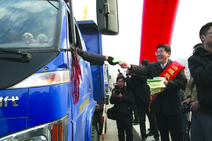 李华中在治超执法现场向过往车辆驾驶人员发放宣传材料。
