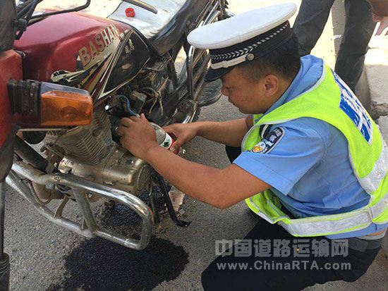 经过民警和驾驶人联合检查后发现是油管破裂,民警郭亚峰立即告知驾驶人,先把油箱的油放出减少损失。民警找来瓶子把放出的油收集起来,对车辆做简单处理后,告知驾驶人不要再骑车了,把车推到修理厂修好后再骑。驾驶人连声说感谢,民警郭亚峰:说不用谢,这是我们应该做的……。