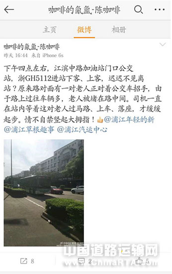 7月4日下午4时,浦江网友@咖啡的氤氲-陈咖啡发图文微博称,“下午四点左右,江滨中路加油站门口公交站,浙GH5112进站下客、上客,迟迟不见离站?原来路对面有一对老人正对着公交车招手,由于路上过往车辆多,老人被堵在路中间。司机一直在站内等着这对老人过马路、上车、落座,才缓缓起步。情不自禁竖起大拇指!”