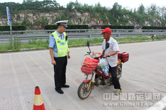 近日,省高速交警总队二支队沂源大队巡逻民警发现辖区一名老汉“淡定”的骑着摩托车在应急车道内,走走停停捡东西,民警赶紧劝离,及时消除了安全隐患。