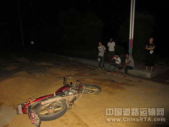 经询问当事人,民警得知,当晚,肖某(男,28岁)驾驶赣F8N5XX(后载章某,男,21岁)由上顿渡镇出发,前往秋溪镇观看水上乐园演出,同时,吴某(男,45岁)驾驶两轮电动车(后载邓某,男,26岁)跟随其后前行。由于前方道路路面晒有大量稻谷,加上夜晚视线不清,两部车辆先后受稻谷摩擦打滑摔倒在稻谷上,致使肖某、章某与邓某三人的四肢外表都被擦伤,幸好无大碍没有骨折。