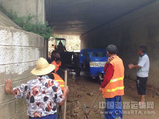 7月23日晚,包茂高速公路延安段发生连续强降雨,局部地方降雨量达到80毫米。24日早9时,养护巡查人员发现K550+300上行通道桥两侧锥坡、排水渠由于山体排水量大,桥头锥坡被雨水冲毁,水沟破损,致使淤泥、石头全被冲到通道桥内,交通受阻,已影响到当地居民出行及公路安全。