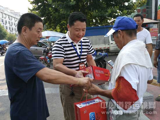 7月26日下午,酷暑盛夏,热浪滚滚。当金华出租车稽查队员徐朗明接过浙江双飞客分永安党支部负责人卢志培的清凉慰问品时连声说:“谢谢关心!我们一定会坚守岗位,打击黑车带客,维护好客运秩序。”卢志培说:“在这种高温烈日的天气底下,你们起早贪黑,不畏艰辛地在一线工作岗位上,也是为护航G20峰会做出奉献,谢谢你们!”